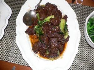 Caramelized spicy beef (he used prime hangar steak which was particularly tender)