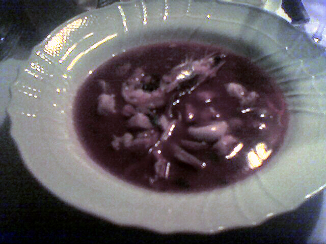 Last week I went to Del Posto, Mario Batali’s Chelsea outpost, with a friend from California. Despite our table upstairs, which was somewhere between Siberia and no where, we had an enjoyable meal. We ordered a fantastic bottle of Tenuta Friggiali Brunello di Montalcino 1999 ( Sangiovese). For the first course we shared two pastas – spaghetti with crab meat & Garganelli al Ragu Bolognese. For the “secondi”, I had Cacciucco – Italian fish stew consisting of several different types of fish and shellfish cooked in wine, tomatoes, and chili pepper (photo). It was excellent but a little too much oil for my taste. For the dolci, we had the Budino di cioccolato – chocolate pudding, chocolate streusel and whipped cream. The food was good, but I would not say great. But the service was – there when you needed something, not when you didn’t.