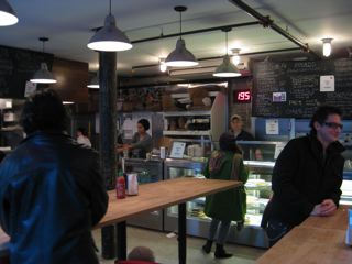 After tasting a small piece of one of the cookies from Momofuku Bakery & Milk Bar , I decided to check it out for myself. The bakery is part of David Chang’s Momofuku empire and is connected to his Ssam Bar. I tried the cornflake-marshmallow-chocolate chip cookie and the compost cookie, a strange but tasty combination of butterscotch chips, chocolate chips, pretzels, and potato chips. And standing in the bakery is actually more comfortable than sitting on one of Chang’s wooden box stools.
