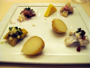 As an early Valentine’s Day celebration, I went with my wife to Aquavit, the Swedish restaurant headed by chef/co-owner Marcus Samuelsson. We both had the herring sampler with cheese and potatoes to start. For the second course, my wife had the Swedish meatballs served with pickled cucumber, lingonberries and mashed potato. I decided on the hot-smoked salmon with red and yellow beets and orange-mustard sauce. I must say,it was one of the best pieces of salmon I have had. It was cooked just right. We ended the meal with the “Arctic Circle” – a goat cheese parfait with black currant sorbet and passionfruit curd and the “Chocolate Custard Cake” – carmelized banana and cashew ice cream. It might have been Friday the 13th but we certainly had good luck today. By the way, the restaurant has a great bar.