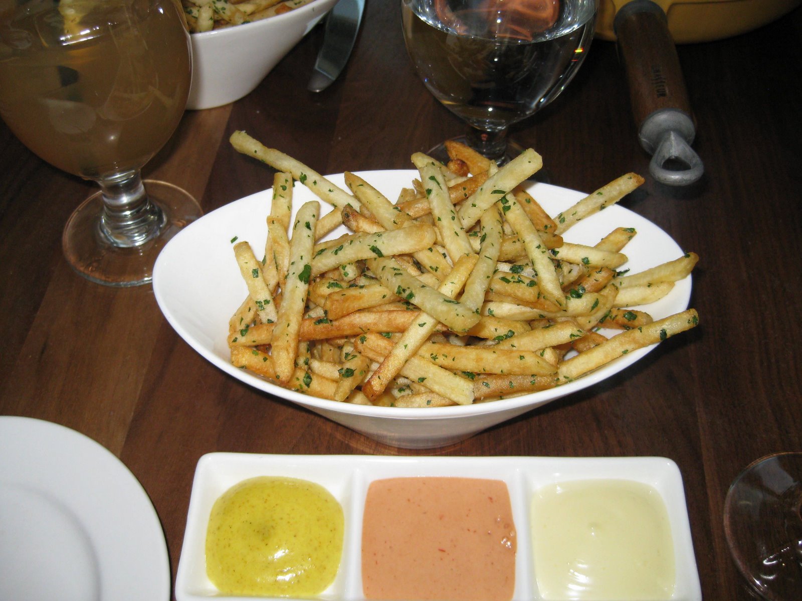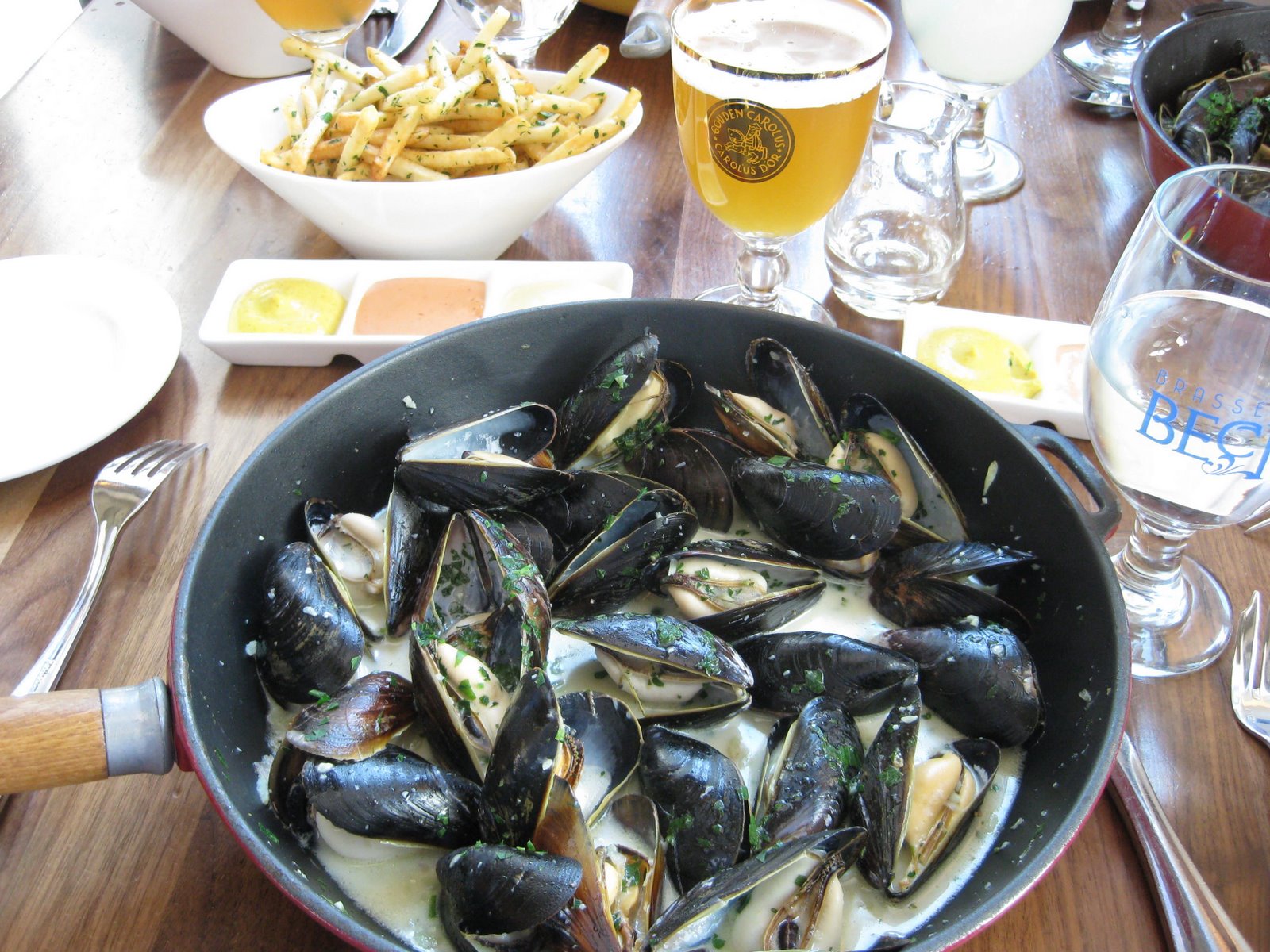 On Monday I went to Brasserie Beck in Washington, DC with my brother and son for a Belgian-style lunch. We of course had mussels and all ordered the traditional style – steamed with white wine, garlic and parsley. They were served with a nice bowl of crispy frites and a trio of mayonnaise. There was plenty of baguette to sop up the broth. We finished the meal with two desserts – a clafoutis with fresh fruit and a warm pear tarte tatin with crème frâice ice cream. Finally we had some excellent coffee served in a bodum press pot. A good time was had by all and definitely worth a visit.