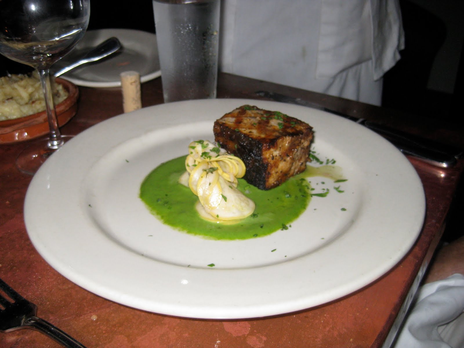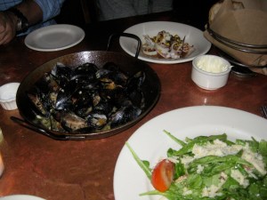 We started with the Fore Street’s Summer Salad of Maine tomatoes, reggiano, rocket, and sherry vinegar and olive oil dressing; wood oven roasted Maine mussels and wood grilled marinated squid (Rhode Island). This was paired with a bottle of Roussanne from the Languedoc region in south west France.