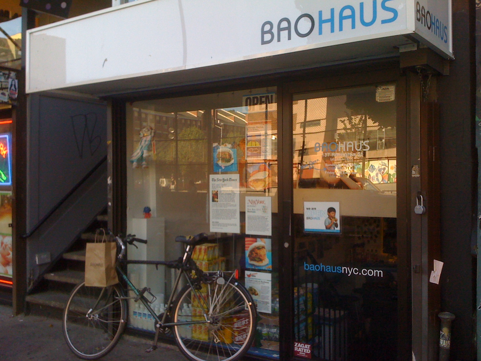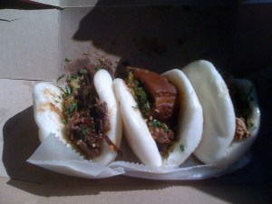 Last week I rode down to Rivington Street to try some bao at Baohaus. I ordered 3 of them – ‘skirt steak’, pork belly and chicken. The pork belly was very tasty but the beef one was a bit dry, and at $4 a bao, not really worth it. So I decided to supplement the 3 bao with an order of Prosperity Dumplings.