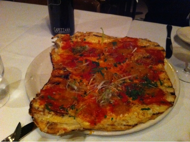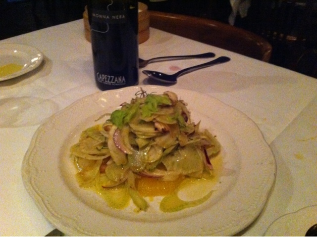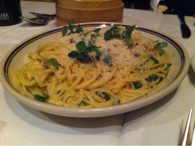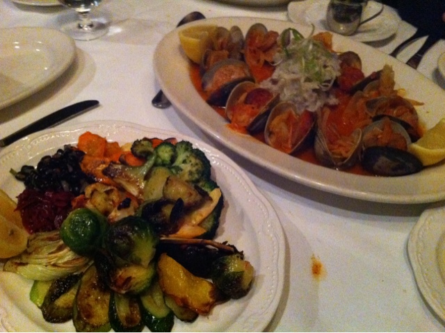 Next course – linguini with egg, duck bacon and pea tendrils. Finished the savories with spicy clam roast with hot sausage and mash potatoes and a plate of grilled vegetables. For desert we had the signature grand cookie finale and a kumquat and orange meringue tart.