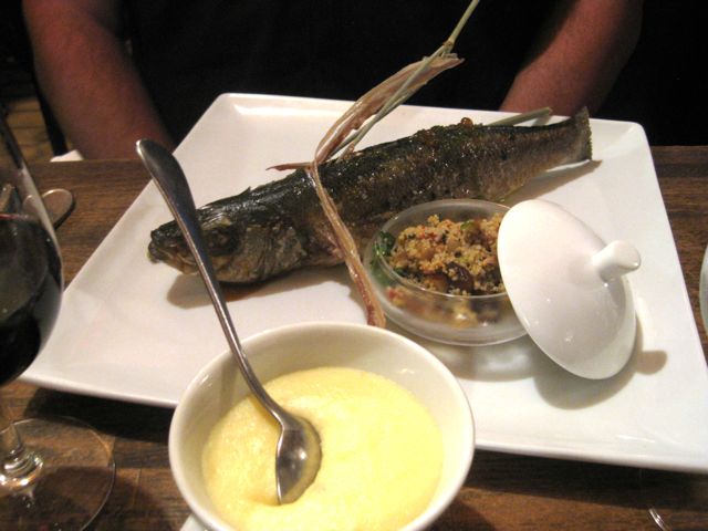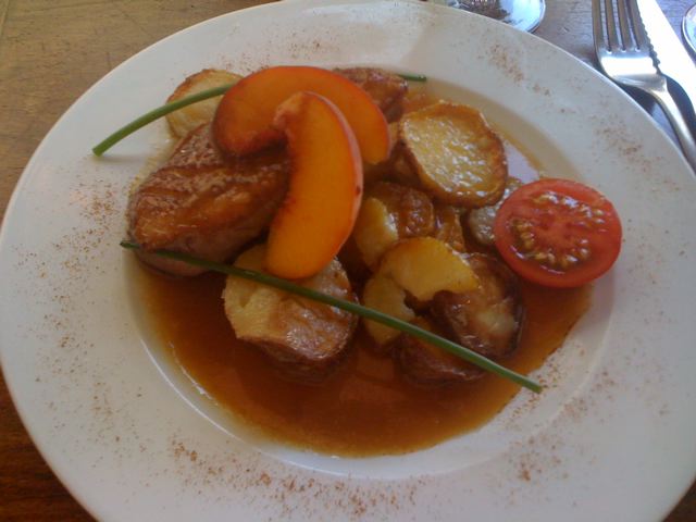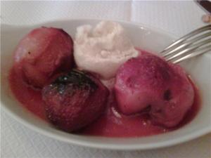 For dinner I settled on Le Petit Flore (19, rue du Garet – 69001 Lyon; 33 04 7827 2751 after reading the recommendation in the Times article. I started with a chilled Terrine de Sandre (white fish), which was served with lightly dressed greens and a fresh tomato coulis. The terrine was very light and the coulis was a nice accompaniment. Next up was the Gateau de Fois de Volaille (poultry livers) sauced with a reduction of red wine, stock and studded with lardons. This was served with Lyonnais potatoes and an eggplant souffle. For dessert I had the Clafoutis de Mirabelle (plums) which was a nice way to end the meal. All in all this was a very good meal and definitely worth the 24 euros.