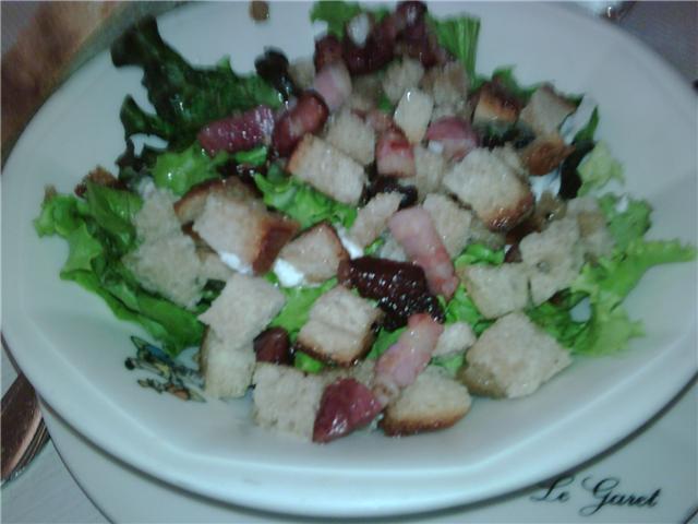 Continuing my quest for authentic Lyonnais cuisine, I again made my way to rue du Garet for lunch at Le Garet (7, rue du Garet – 69001 Lyon; 33 04 7828 1694). I noticed upon entering that this would be the real deal. After being seated at the communal table with a bunch of locals, I began my meal with the Salad Lyonnais. Crisp romaine lettuce, croutons, poached egg and lardons. A classic preparation and very good as the dressing didn’t overpower the egg.