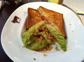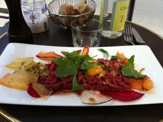 After a medical emergency forced the temporary closing of the beautiful Piscine Keller I decided to rent a “Velo Libe” and head over to Yves Camdeborde’s Le Comptoir on rue de l’Odéon just off Boulevard Saint-Germain. I started with a croque monsieur au saumon fumé. Normally I don’t like smoked salmon cooked but this was delicious. Perfectly grilled, cheesy, not too greasy. Next I had the tartare de bœuf (his way) which replaced the usually french fries or roasted potatoes with some cold, crispy vegetables. These made it a little bit ‘lighter’.