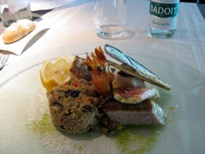We had a panino with duck ham, Taleggio cheese and hen-of-the-woods mushrooms (this comes apparently from Canora’s days at Craftbar), crisp risotto balls with beets and blue cheese; and lamb sausage with fresh sage.