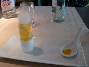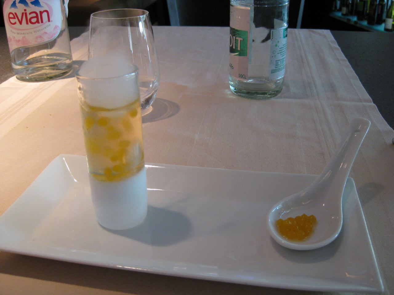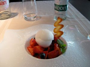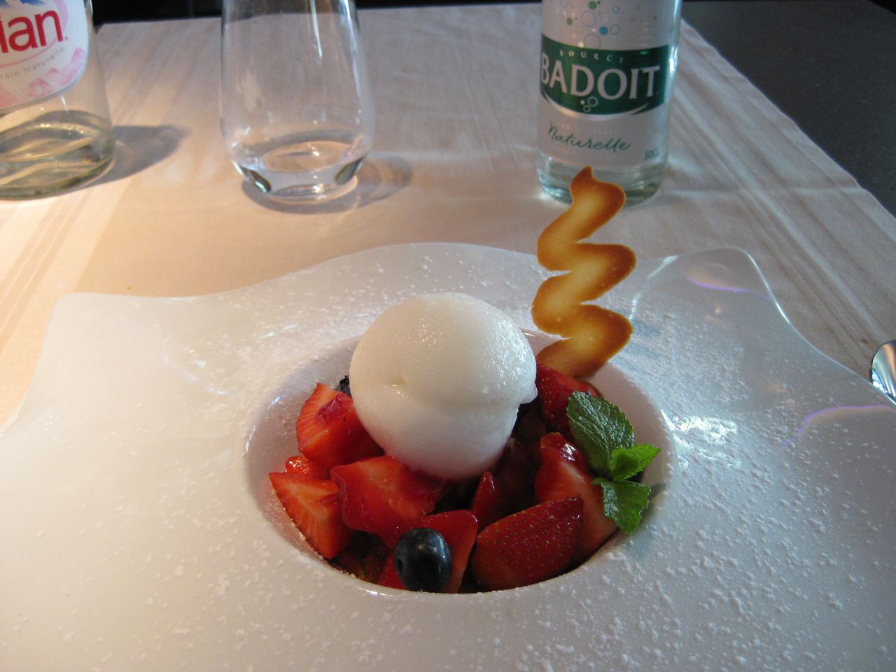 Amuse-Buche (Sweet) – this was some sort of passion fruit ‘caviar’ served in a frozen glass at minus really cold and finally, fresh strawberries with lemon sorbet.